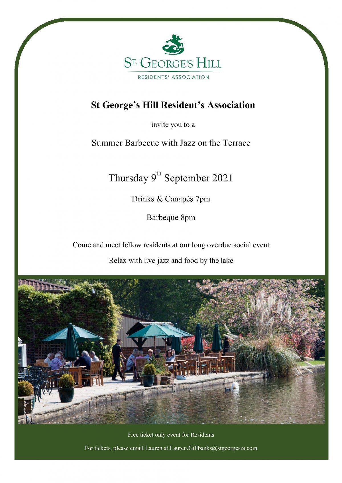 We are excited to announce that we will be holding a Resident only Summer BBQ at the Tennis club, on Thursday 9th September at 7PM. This event will be free of charge due to the missed events caused by covid. There will also be a wonderful live Jazz band attending!